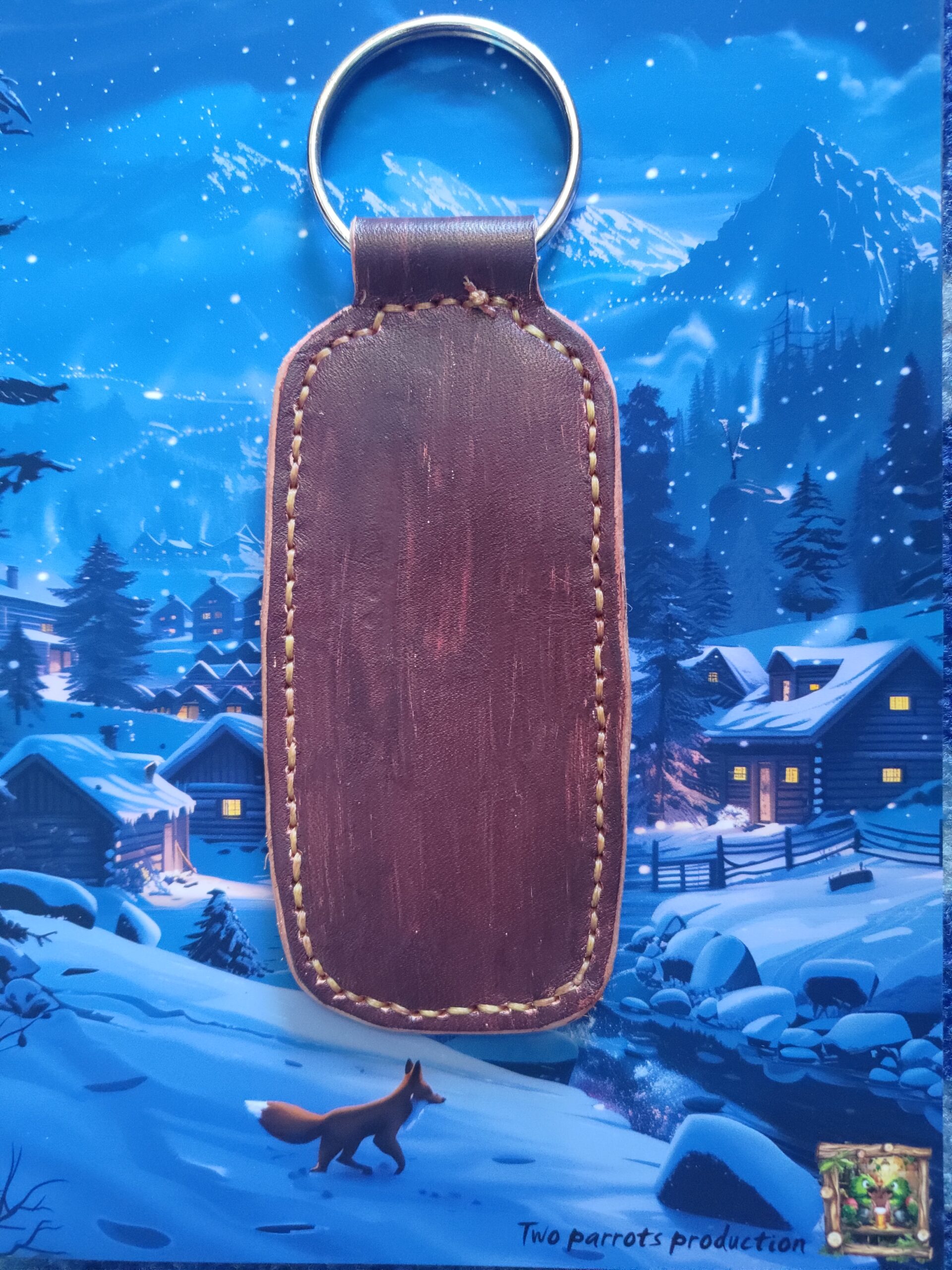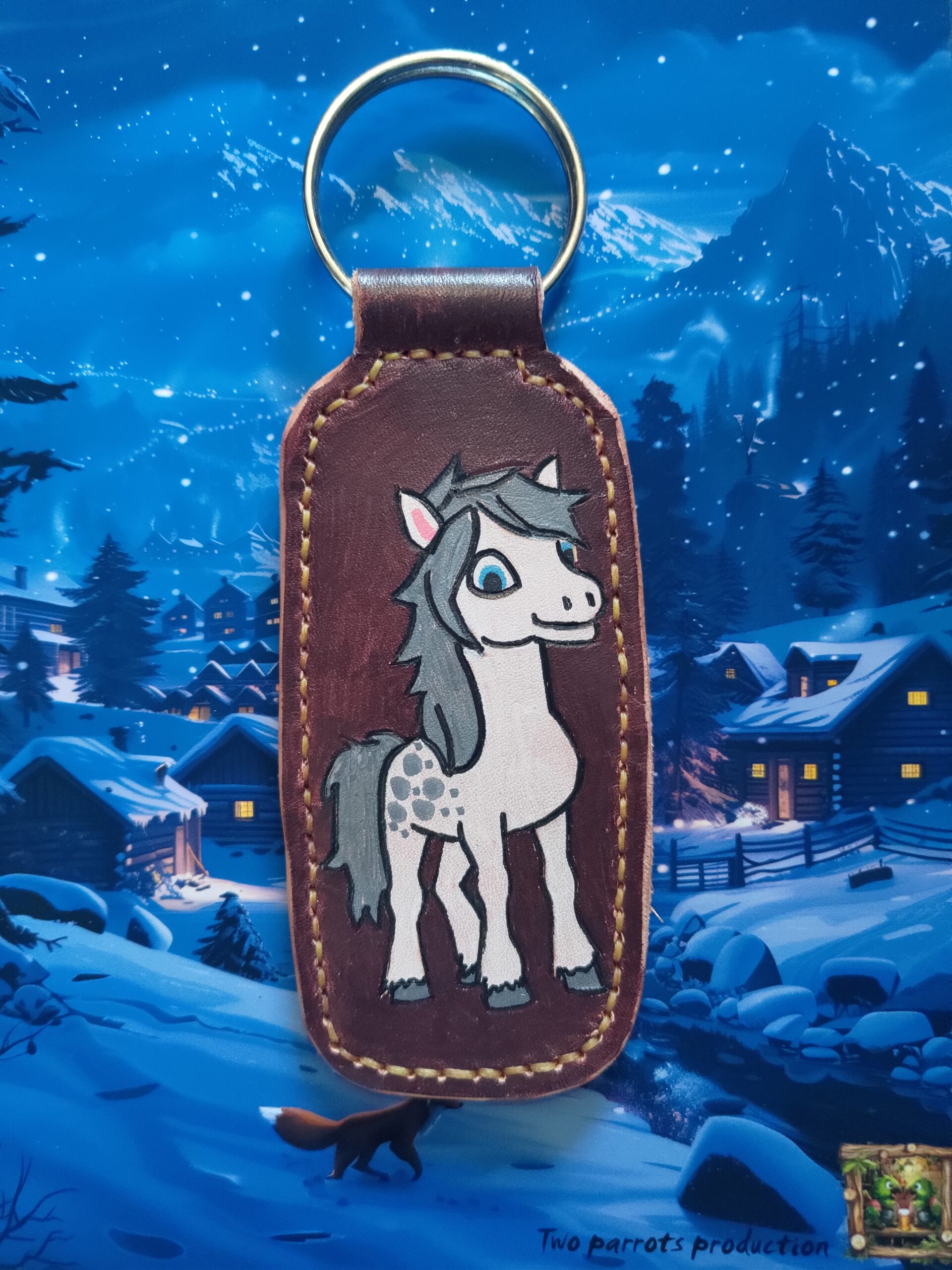 Ručně šitá, rytá a malovaná kožená klíčenka s koníkem – bělouš.