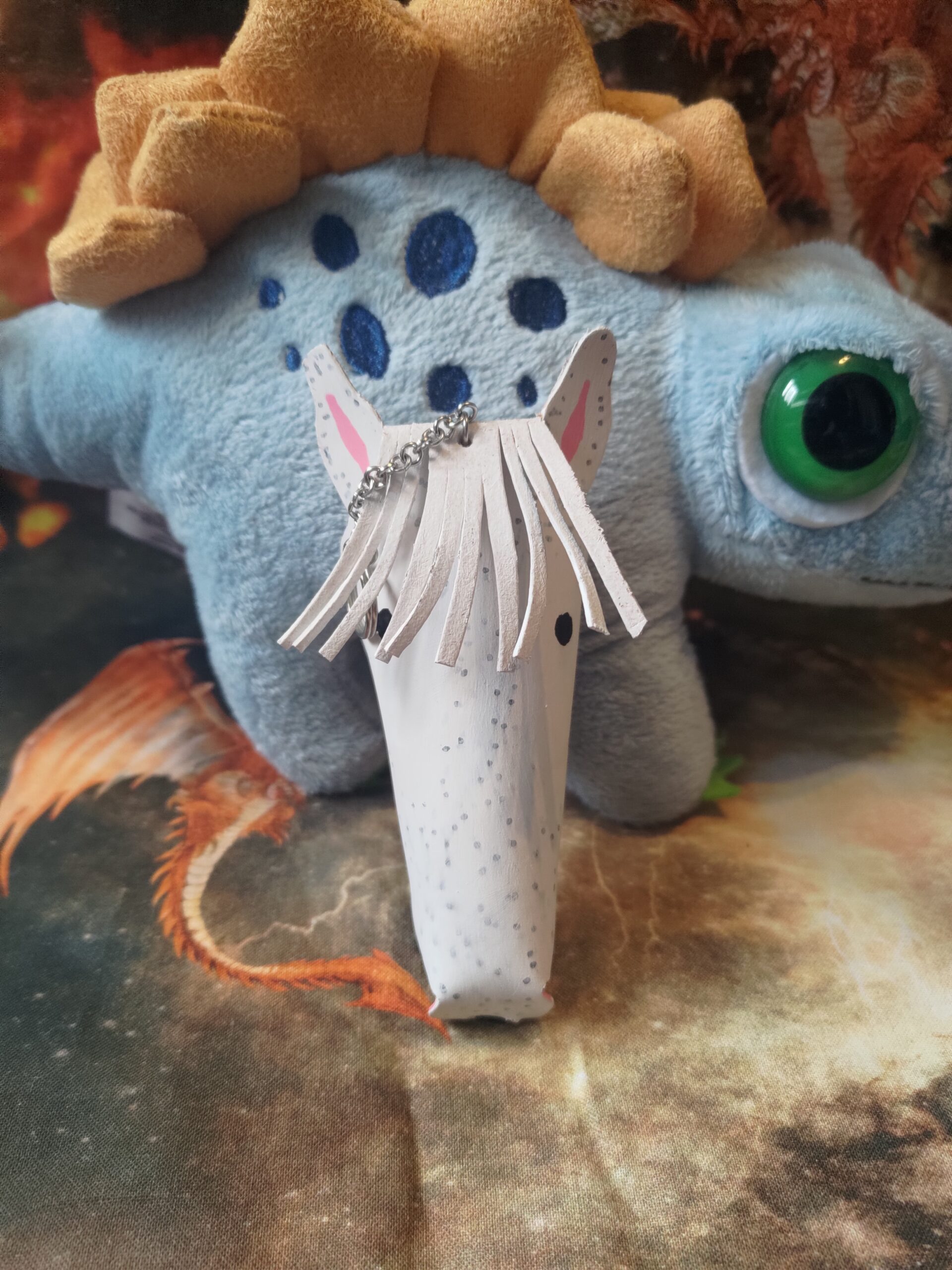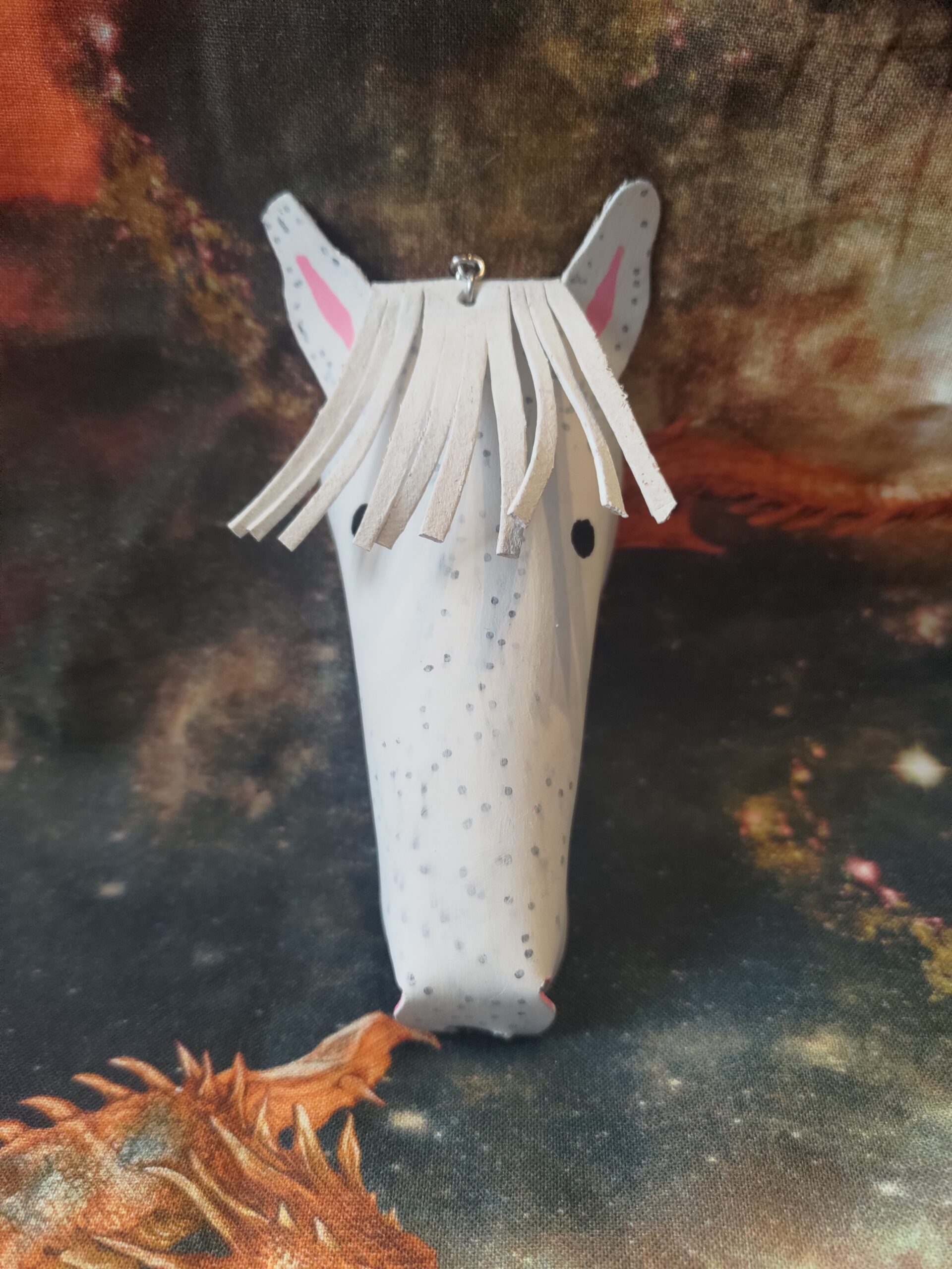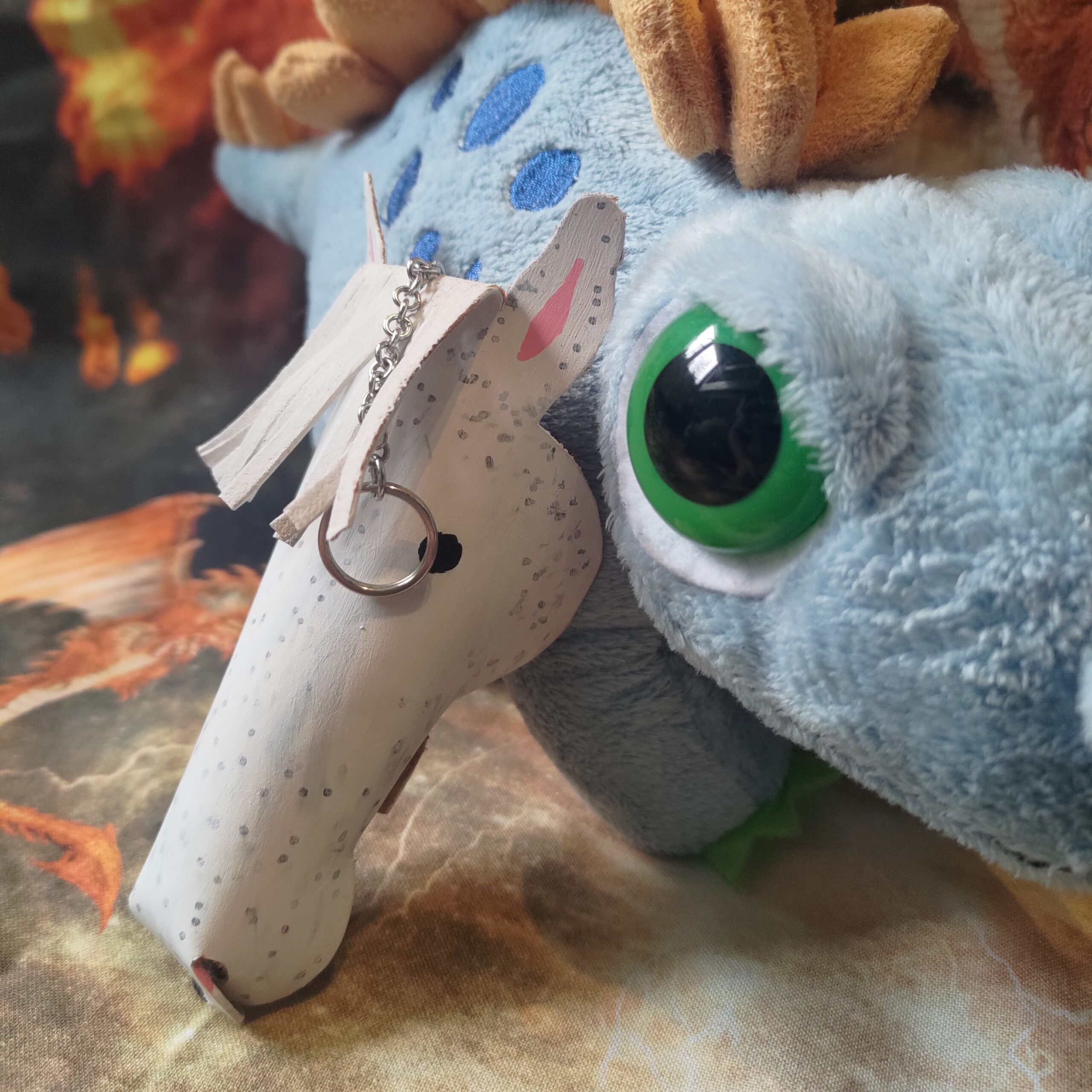 Kožená klíčenka, koňská hlavička.Tečkovaný běloušDélka cca 12 cm.