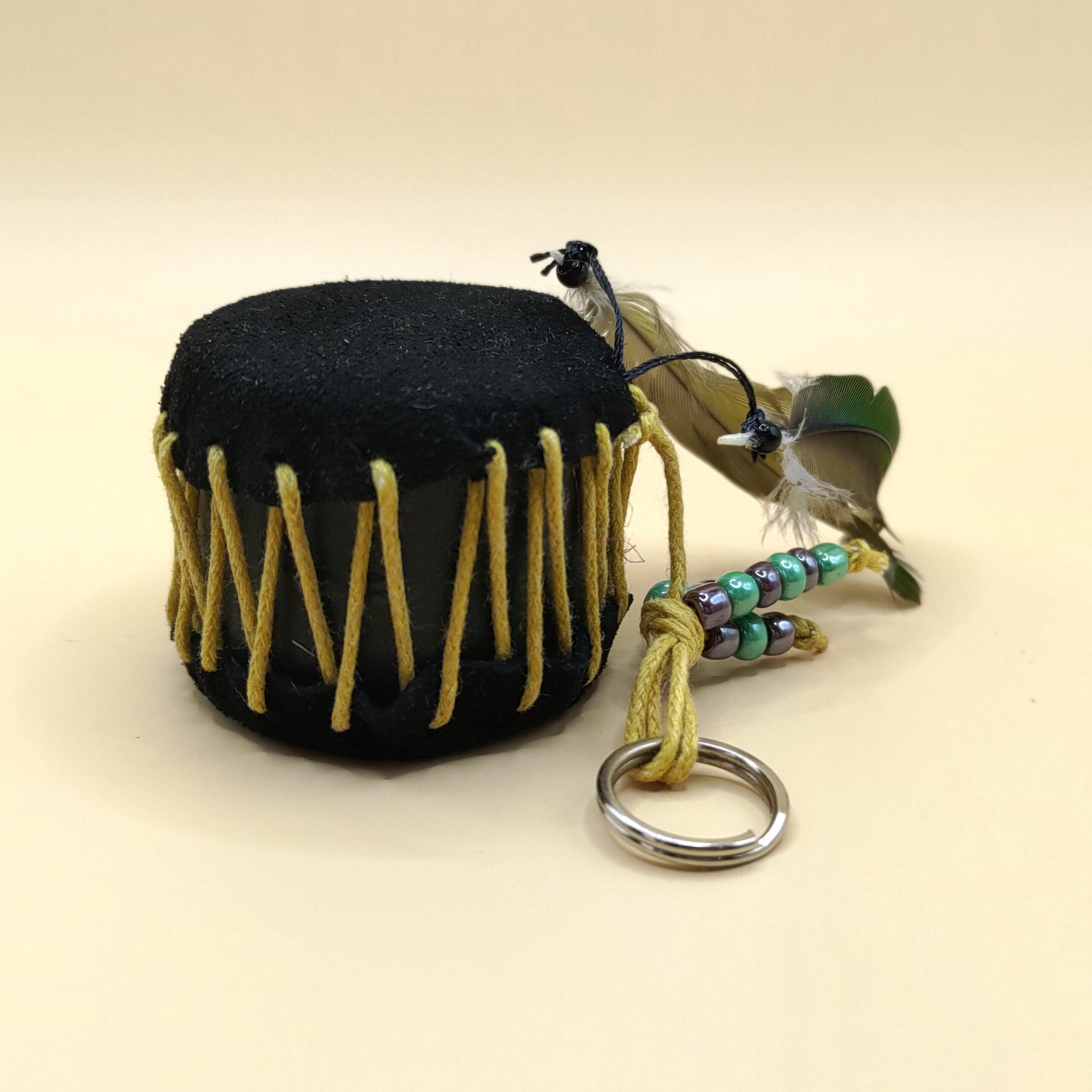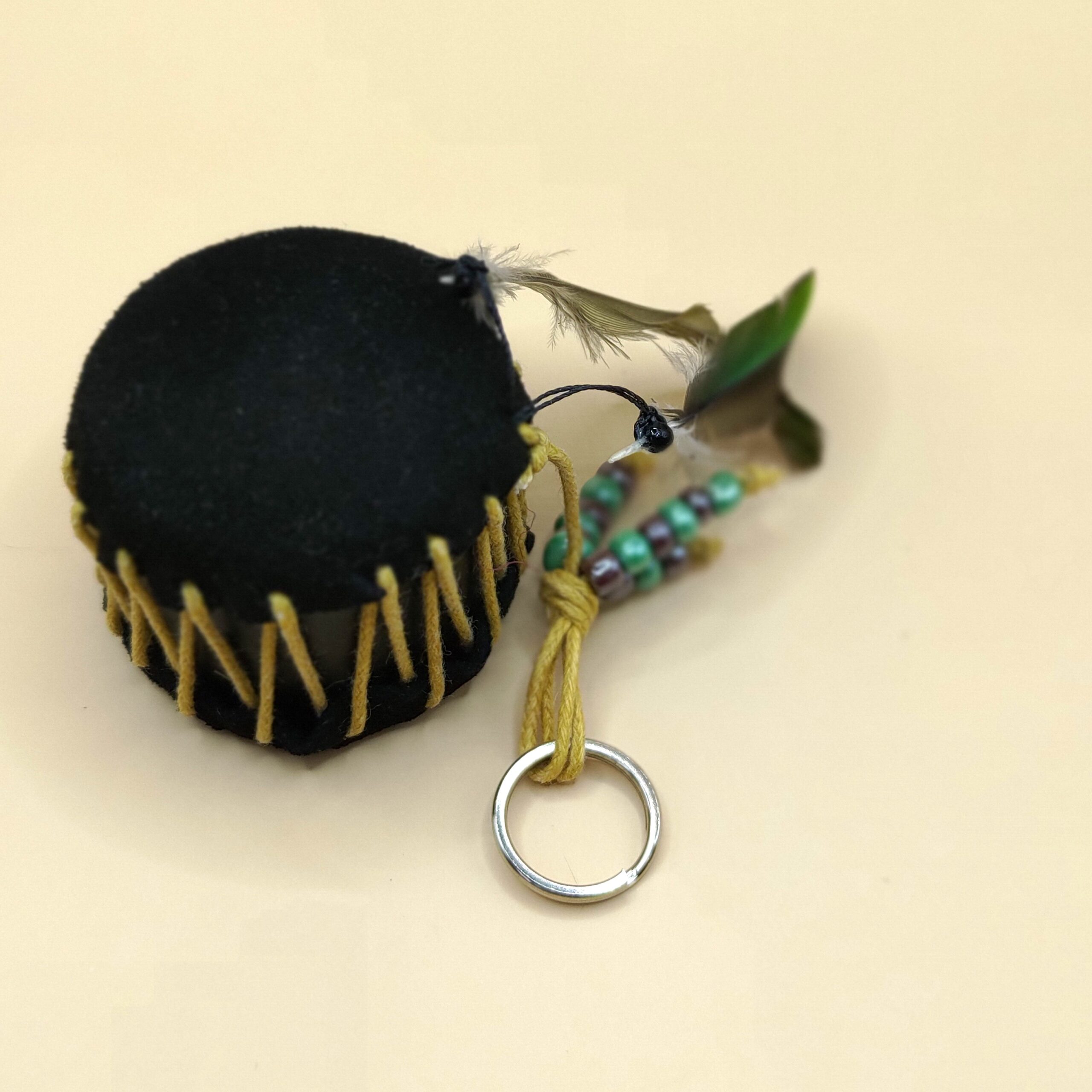 Miniaturní indiánský bubínek z černé jehnětiny, tvrdého kartonu, voskované šňůrky, korálků a papouščích peříček.