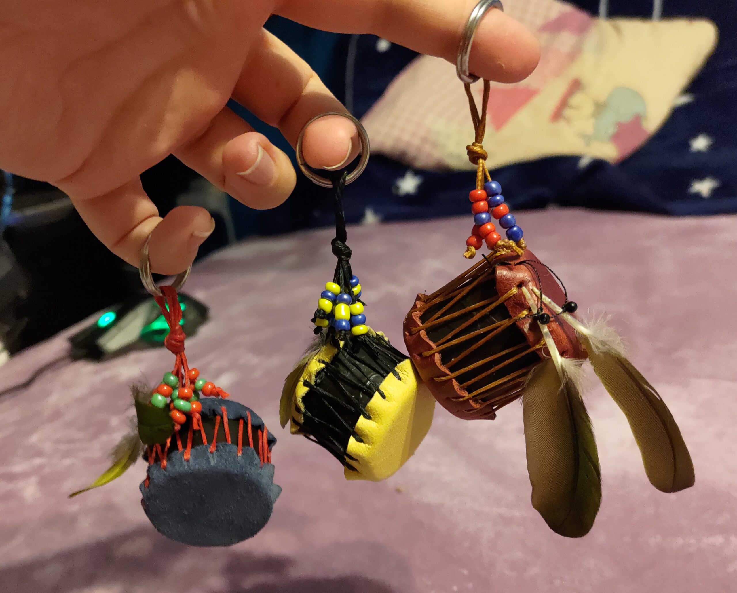 Miniaturní indiánský bubínek z jehnětiny, tvrdého kartonu, voskované šňůrky, korálků a papouščích peříček. Po objednávce Vás kontaktujeme s aktuální nabídkou barev kůže.