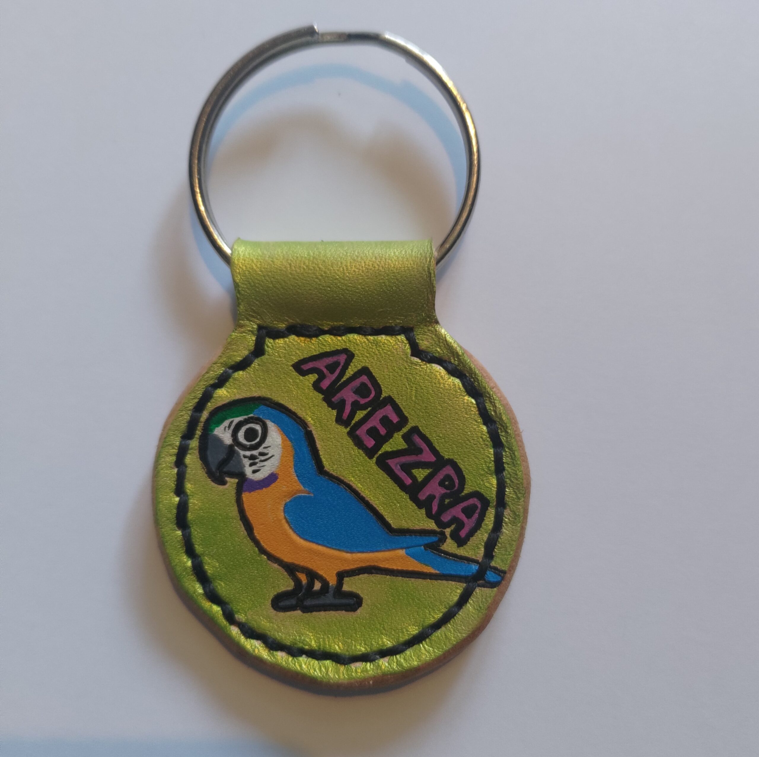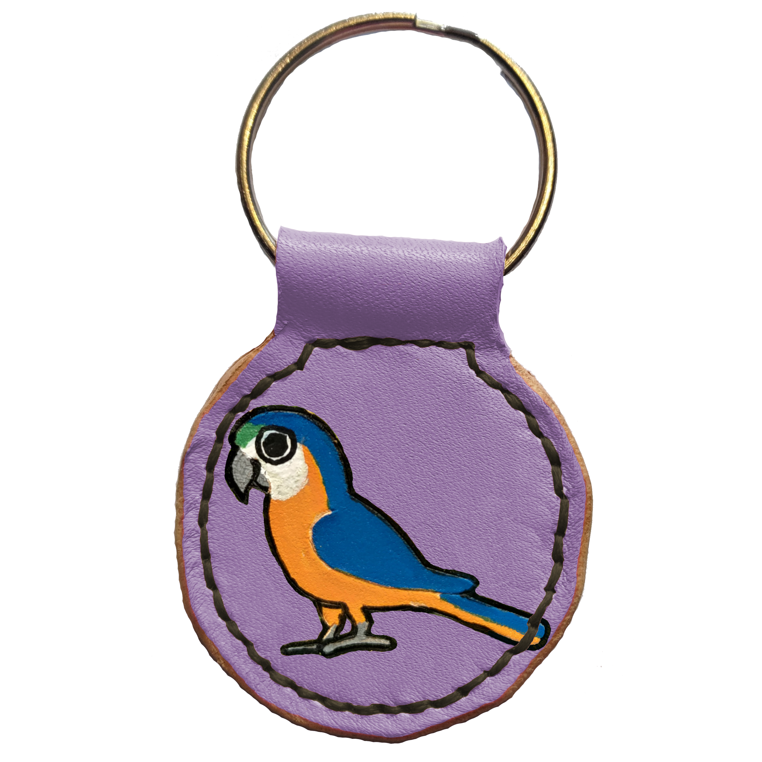 Ručně šitá, rytá a malovaná klíčenka s motivem papouška. Z pravé hovězí kůže, malovaná akrylovými barvami.