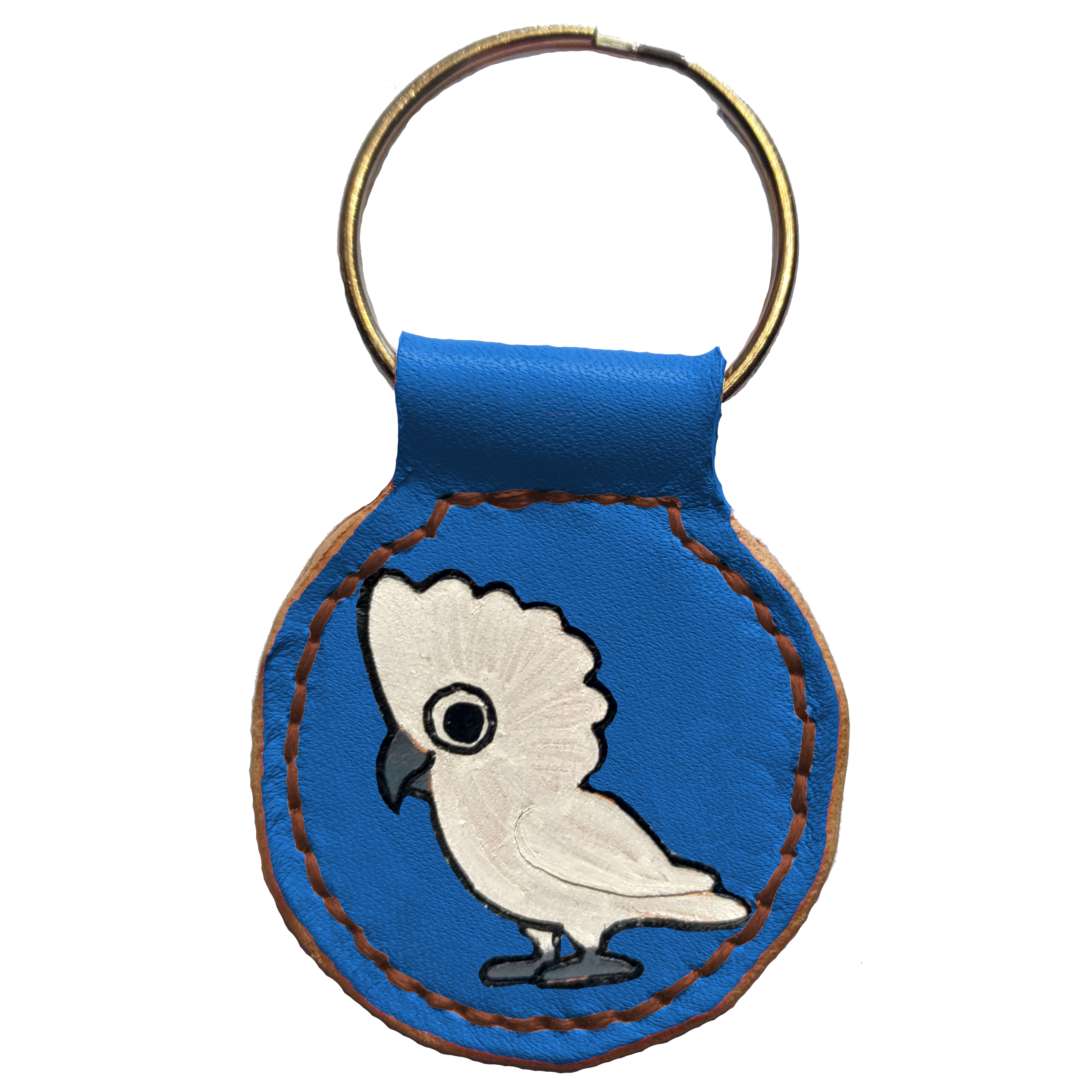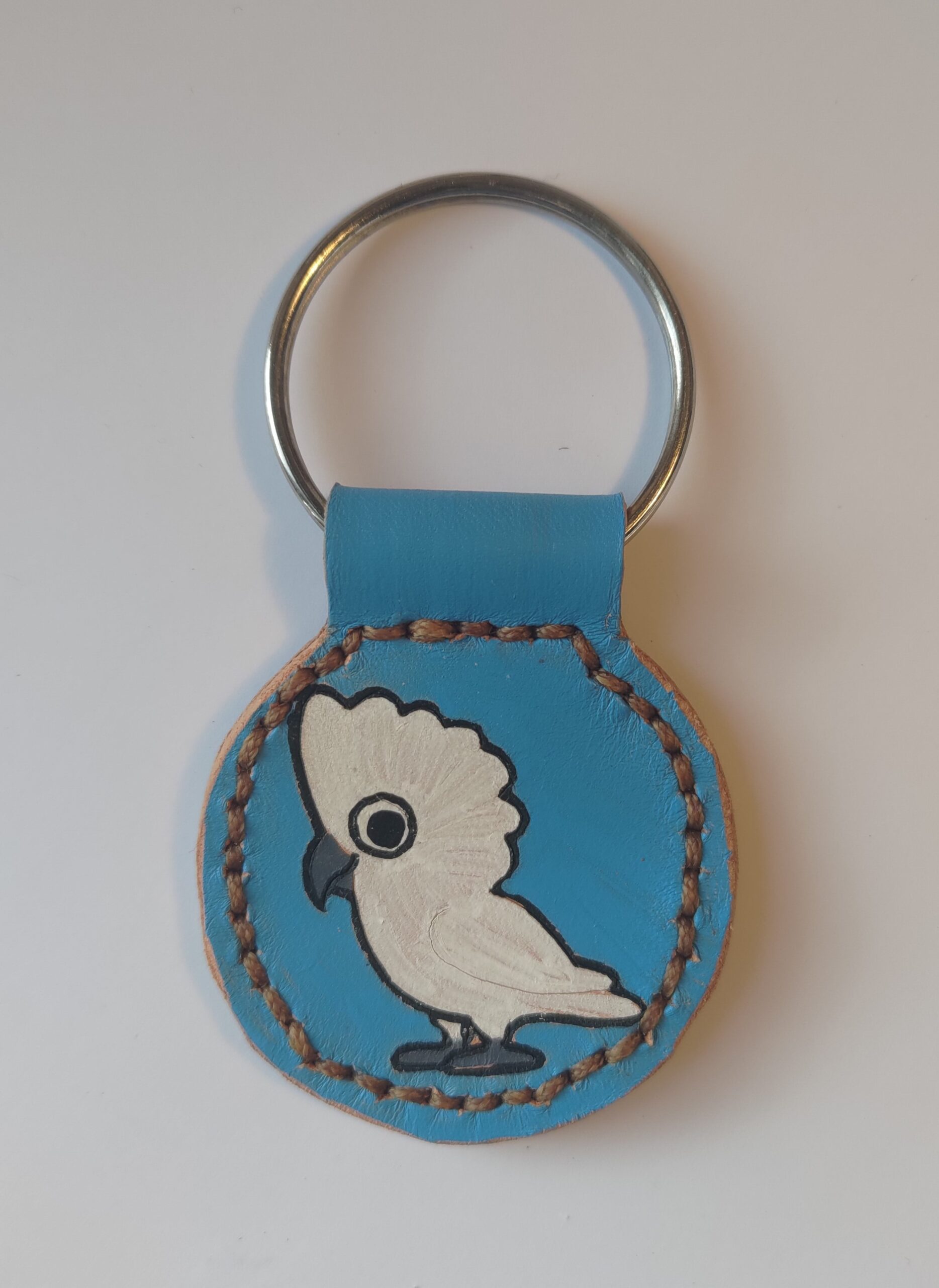 Ručně šitá, rytá a malovaná klíčenka s motivem papouška. Z pravé hovězí kůže, malovaná akrylovými barvami.