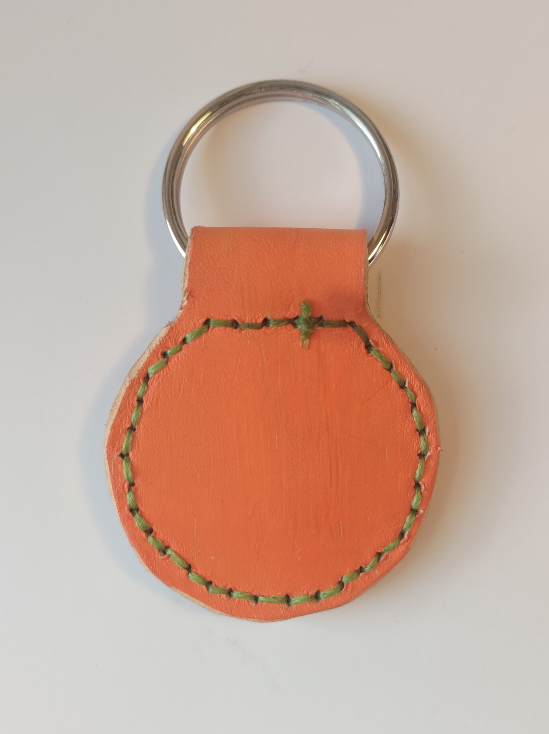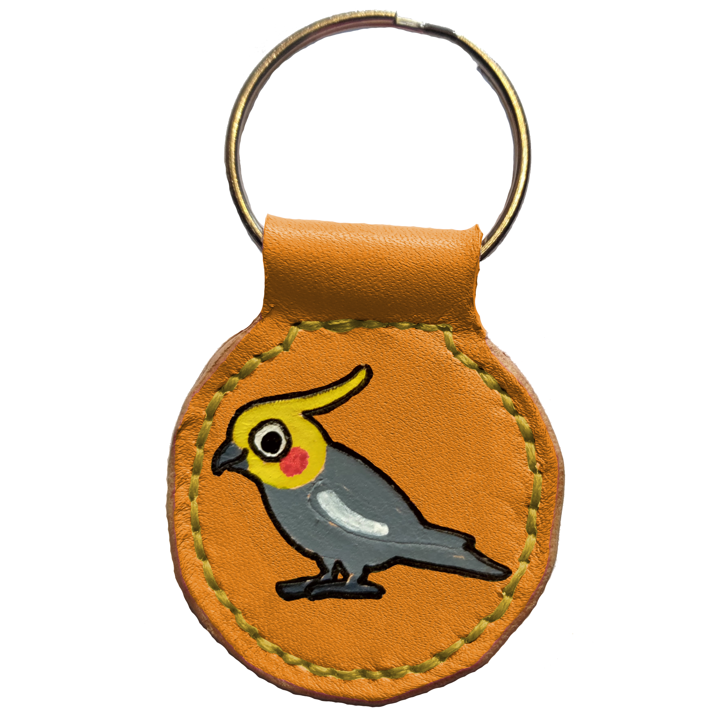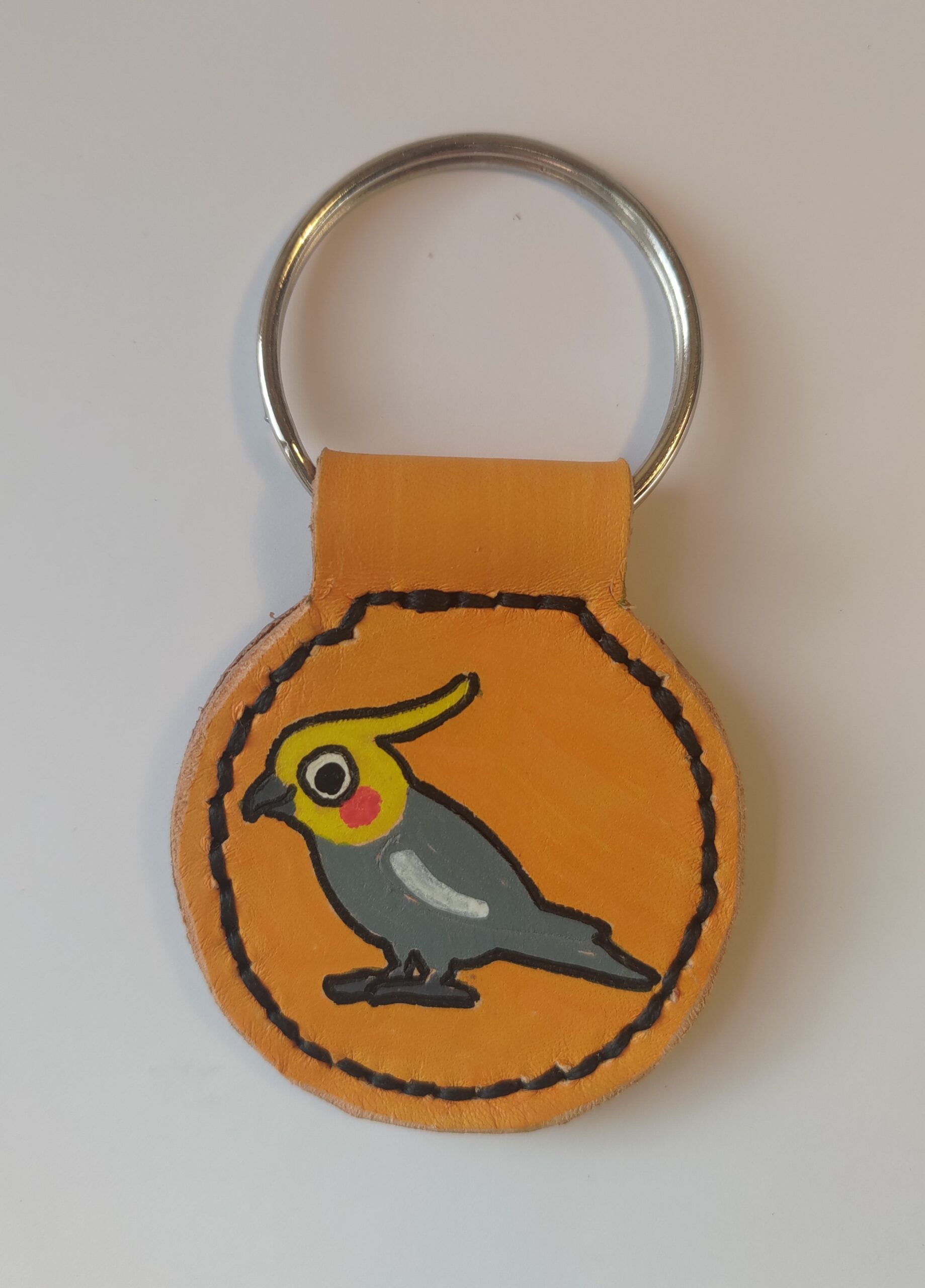 Ručně šitá, rytá a malovaná klíčenka s motivem papouška. Z pravé hovězí kůže, malovaná akrylovými barvami.