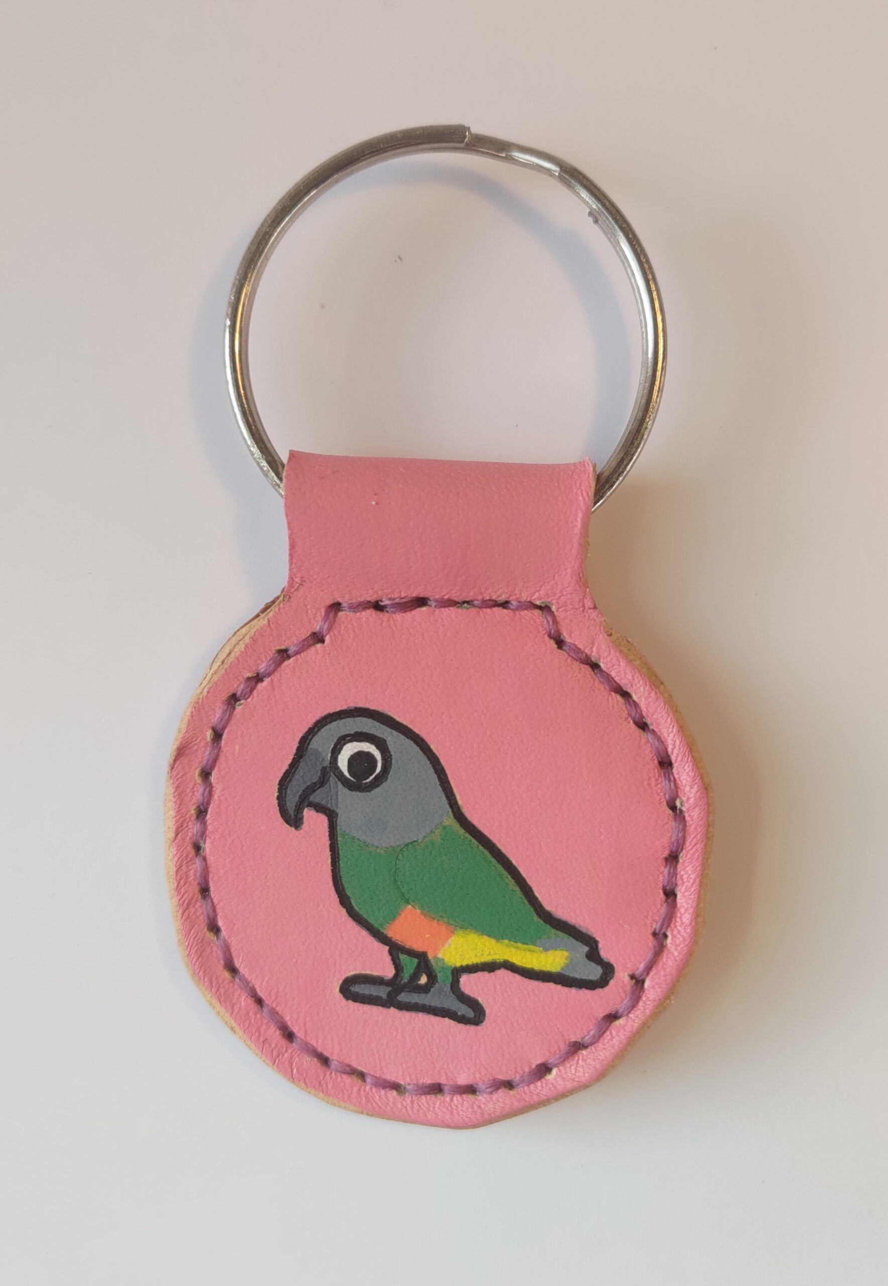 Ručně šitá, rytá a malovaná klíčenka s motivem papouška. Z pravé hovězí kůže, malovaná akrylovými barvami.