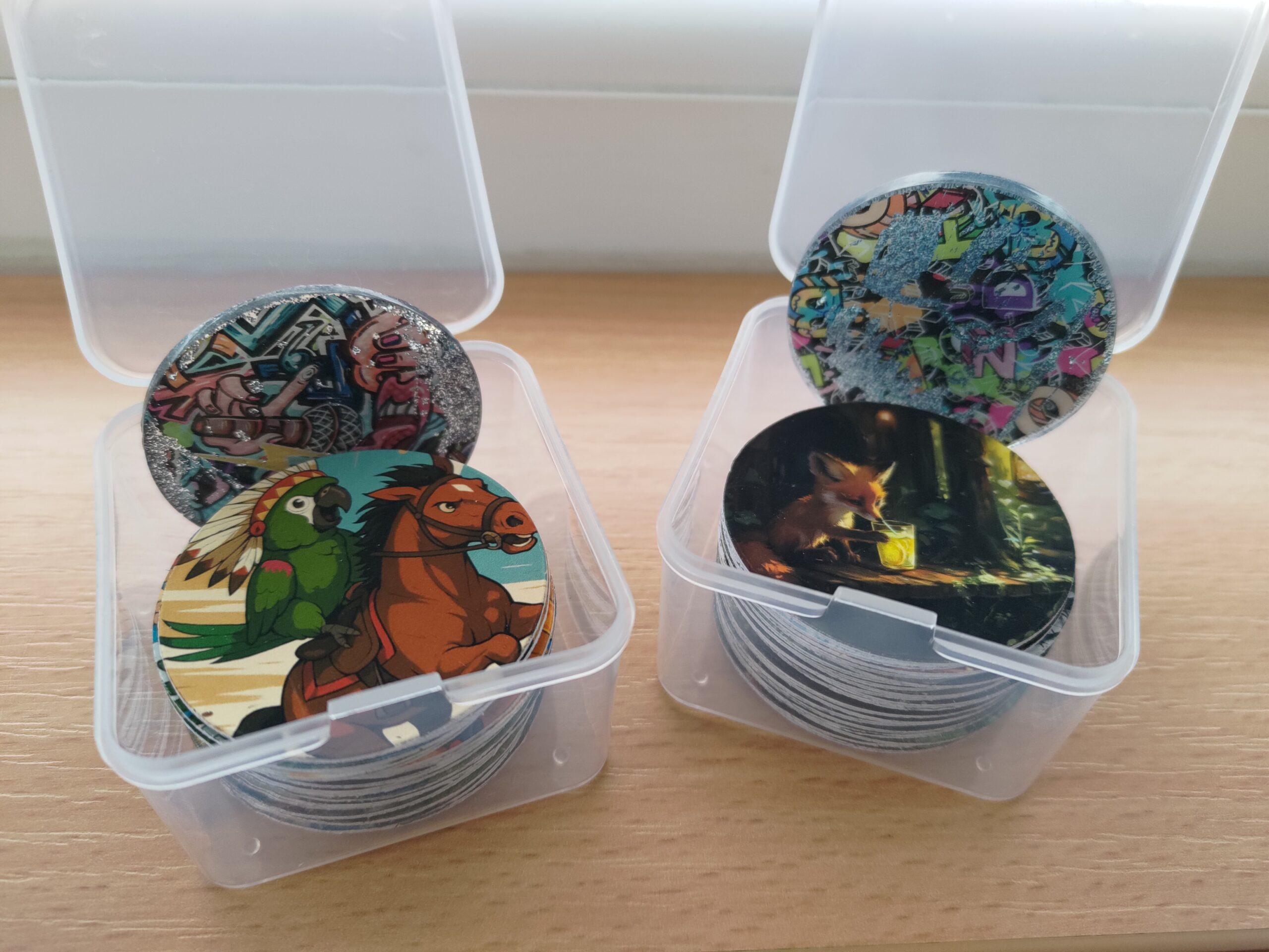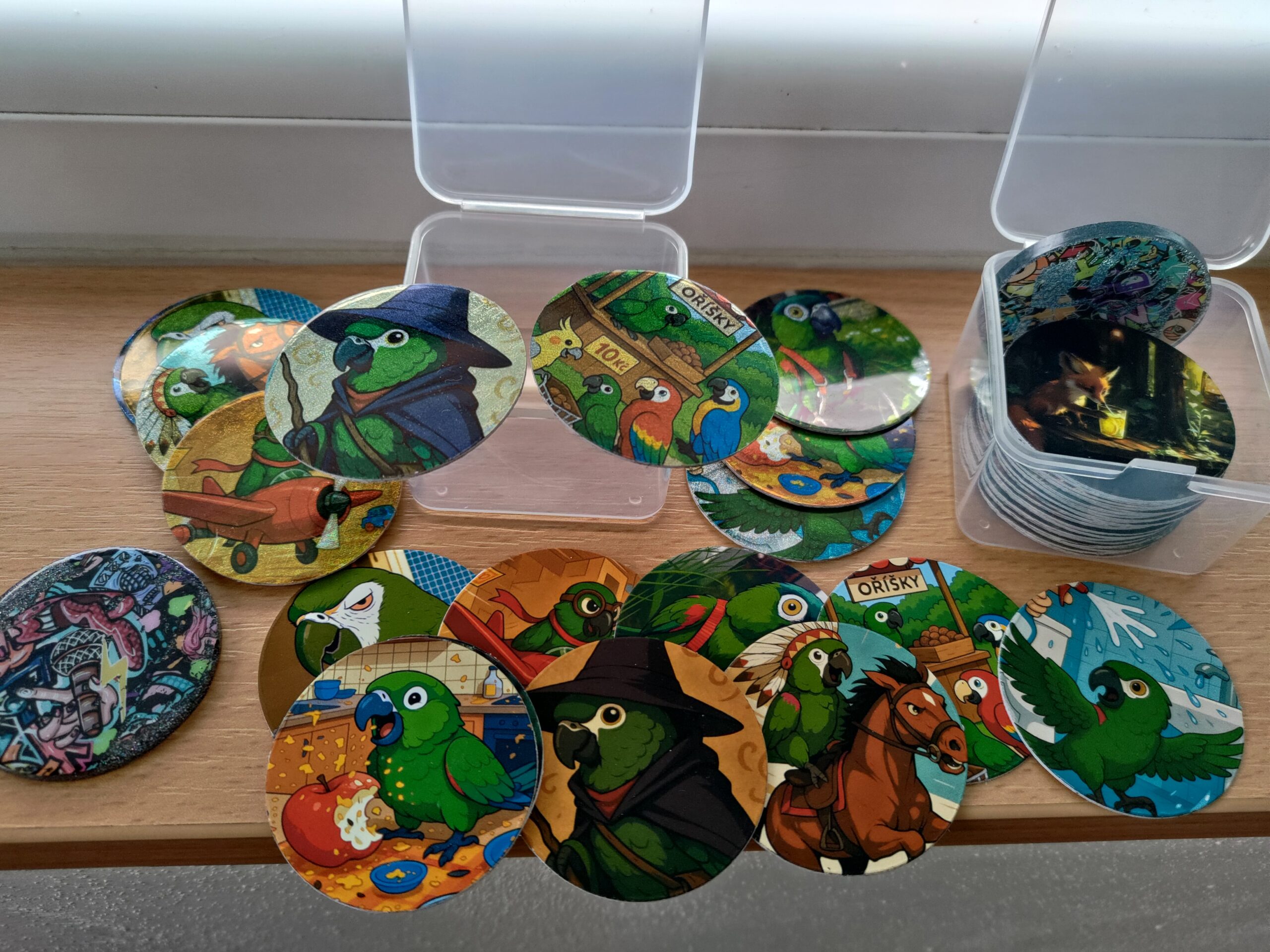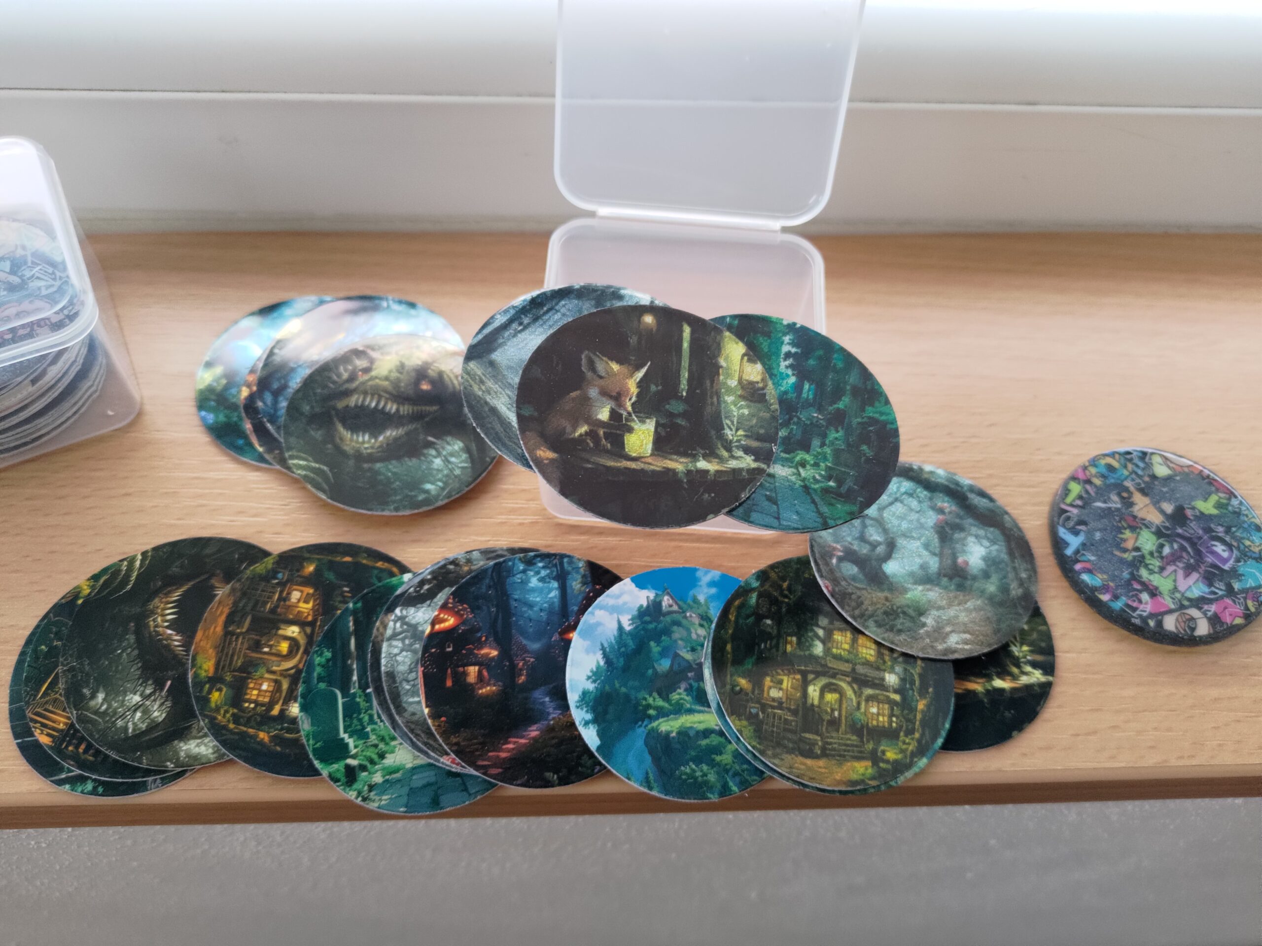 Žetonky z tvrdého papíru pro hru pogy. Náhodný mix motivů.